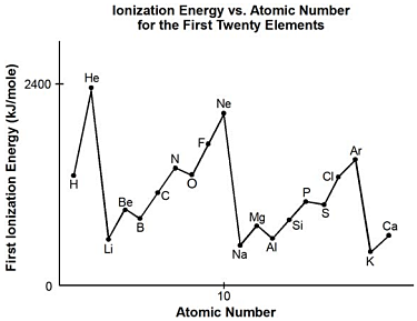 The graph of first ionization energy plotted against atomic number shows that ionization energy is a periodic function. First ionization energy generally increases from alkali metals to noble gases. Exceptions to this general trend can be seen in going from beryllium to boron and from magnesium to aluminum. These two deviations from the line can best be explained by considering each element's: