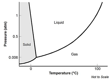 The phase diagram is a graph with a Y-shaped plot. The vertical axis is labeled Pressure in atmospheres, with values marked at 0.006, 0.5, and 1. The horizontal axis is labeled Temperature in degrees Celsius, with values marked at 0 and 100. The horizontal axis extends to the left of 0 degrees C, although no negative values are indicated. The data plot begins on the vertical axis somewhere below 0.006 and curves slightly upward to a pressure value of 0.006 atmospheres and a temperature value of about 10 degrees C. Two lines continue from that point. One goes steeply upward in a straight line, leaning slightly to the left, through a pressure value approaching 1.5 atmospheres and a temperature value of about 0 degrees C. The other curves smoothly upward to the right through a pressure value approaching 1.5 atmospheres and a temperature value of about 105 degrees C. The region of the graph between the vertical axis and the straight line and above the initial curve is shaded and labeled Solid. The region between the straight line and the other curve is labeled Liquid. The region between that curve and the horizontal axis is labeled Gas.