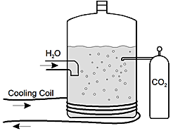 The diagram shows a large cylindrical vessel containing liquid with bubbles in it. A spigot through the left side of the vessel is labeled H sub 2 O with an arrow into the vessel. A labeled Cooling Coil enters the diagram from the left, wraps around the bottom of the vessel three times, and goes out of the diagram to the left. To the right of the vessel is a tank of gas, labeled C O sub 2, with a tube into the vessel.